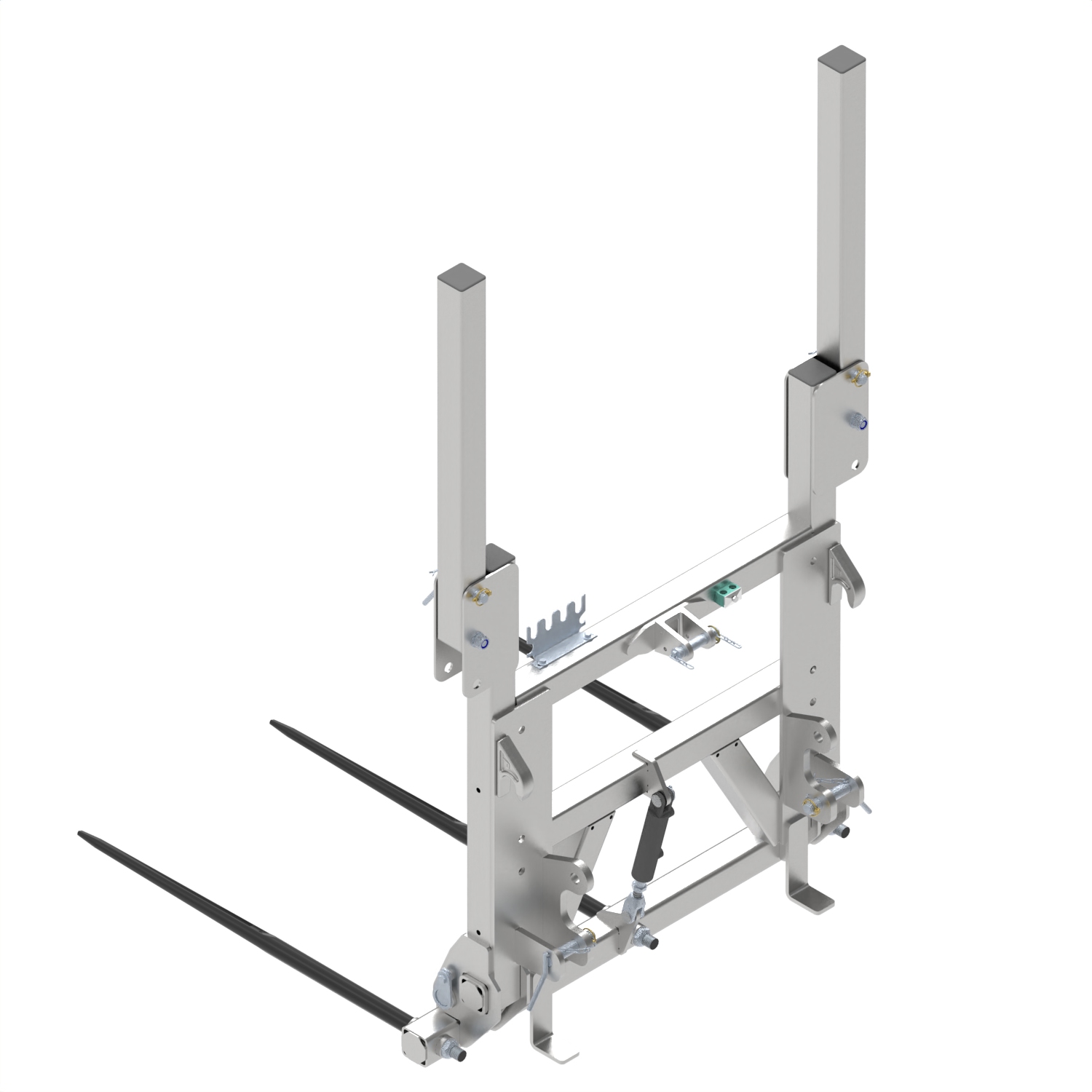 Das Zinkentragrohr kann hydraulisch, 90° nach oben geklappt werden – somit ist kein Zinkenschutz auf der Straße erforderlich