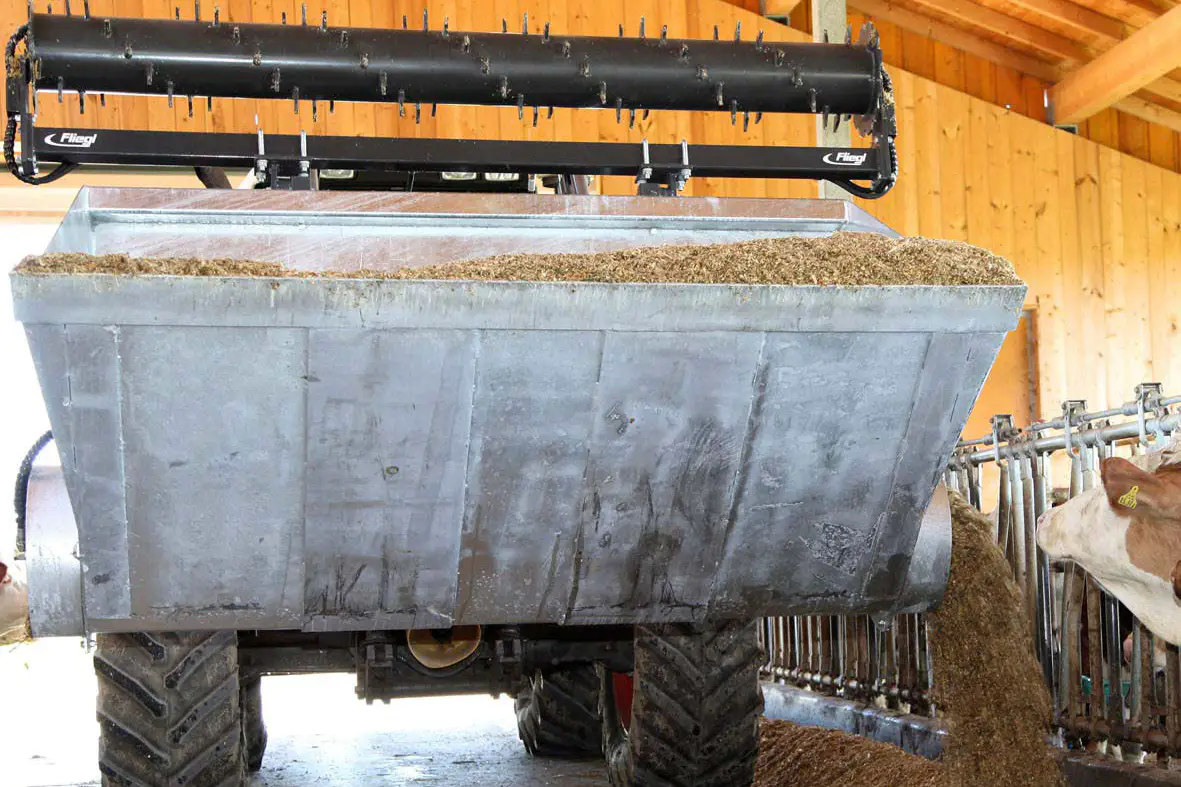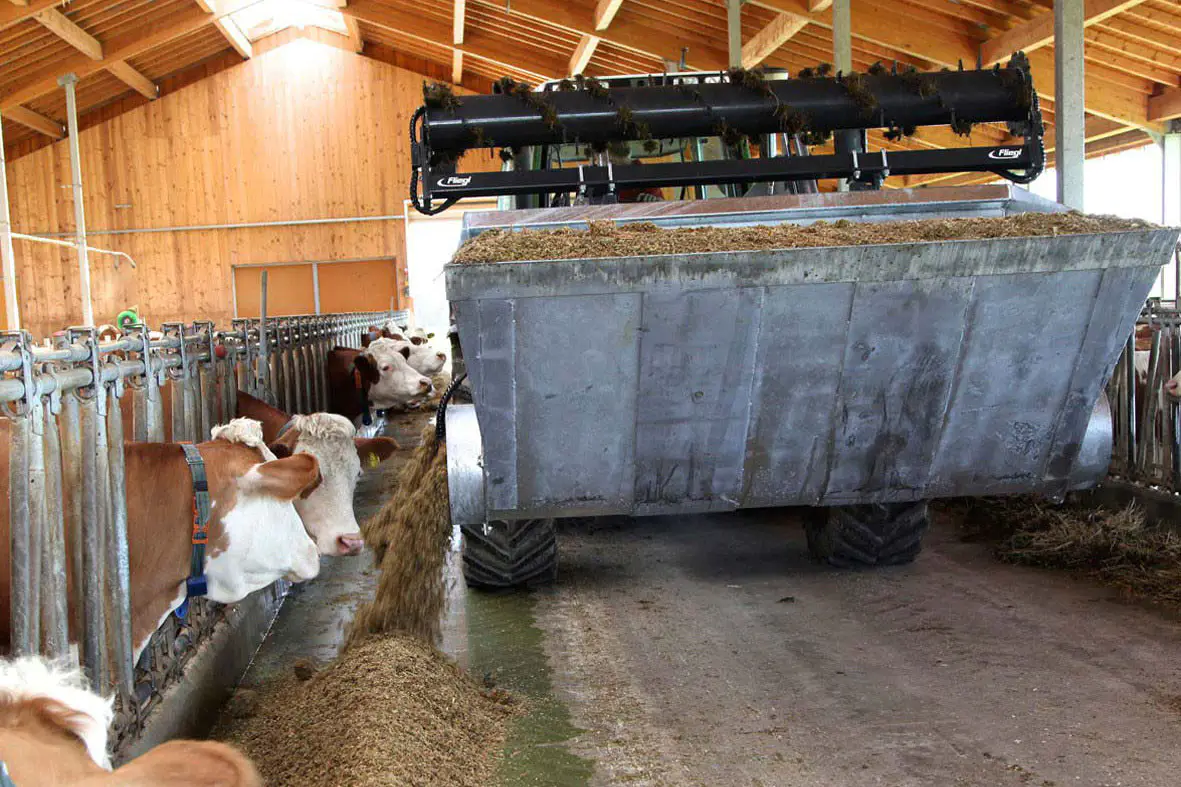 Aufnehmen und Einfüttern in einem Arbeitsgang – mit beidseitiger Ausbringung! Kombiniert mit einer Fräswalze können Sie mit dieser Schaufel die Silage aus dem Flachsilo sorgfältig entnehmen und gleich in den Stall transportieren – größere Nachgärungen sind nicht zu befürchten.
